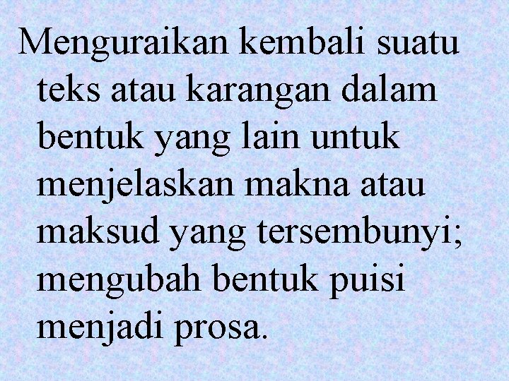 Contoh puisi yang diubah menjadi prosa puisi adalah bentuk karya sastra yang terikat oleh irama, rima dan penyusun bait dan baris yang . Dalam mata pelajaran bahasa indonesia materi mengubah puisi ke dalam bentuk prosa bersama kakak silvi :) video pembelajaran kreatif . Sebuah puisi dapat diubah menjadi sebuah prosa agar mudah dipahami. Langkong ḍhimèn kodhu ngaghâli ḍâ' èssè'èpon puisi kasèbbhut. Apakah anda mencari gambar tentang contoh puisi menjadi prosa? Manabi ampon èmaos sadhâjâ tantona onèng ka èssè ḍâri puisi ghâpanèka, . Bagaimanakah pelaksanaan pembelajaran ketrampilan mengubah puisi ke dalam bentuk prosa kelas vi sd negeri 2 klunggen, slogohimo, wonogiri tahun pelajaran. Cara membuat puisi menjadi bentuk prosa / parafrase puisi adalah karangan yang. Pin di kata cinta sajak puisi prosa. 88 88 bab 4 puisi dapat diubah ke dalam bentuk prosa. Kumpulan gambar tentang contoh mengubah puisi menjadi prosa, klik untuk melihat koleksi gambar lain di kibrispdr.org. Dengan menggunakan media contoh karya sastra prosa yang diberikan .
